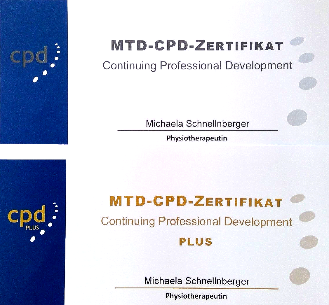 Das MTD-CPD-Zertifikat wird von MTD Austria und Physio Austria vergeben und kontrolliert die gesetzliche Mindestfortbildungspflicht im Gesundheitsberuf (§ 11d MTD-Gesetz). Es freut mich, dass ich im Sinne der Qualität und Patientensicherheit auch die Steigerung, das MTD-CPD-Zertifkat plus, erhalten habe. Dies veranschaulicht eine Teilnahme an Fort- und Weiterbildungen in einem Ausmaß von mindestens doppelt so vielen Stunden wie gesetzlich vorgeschrieben.